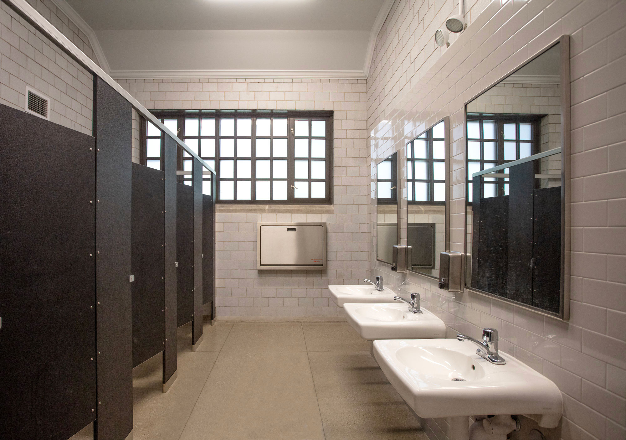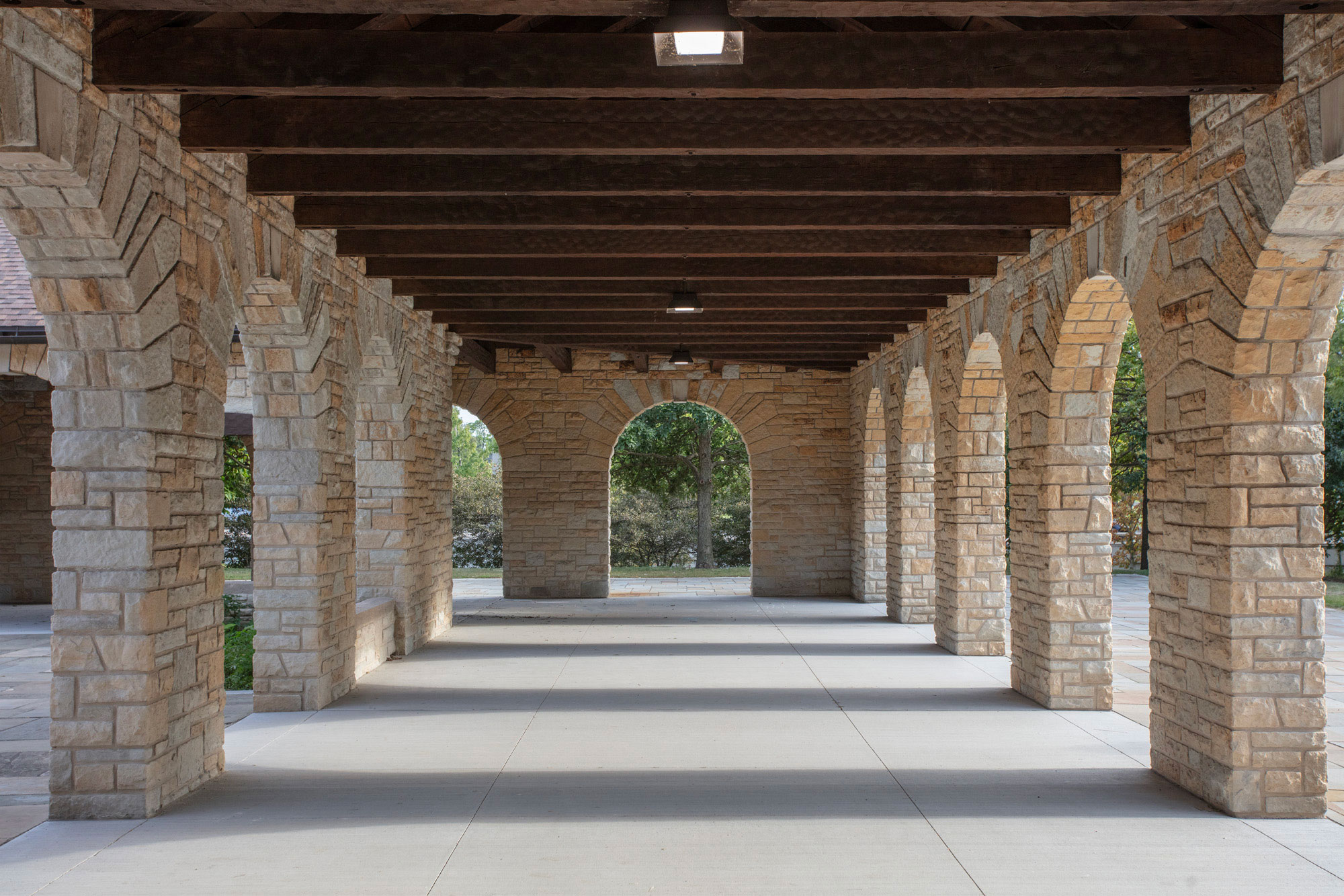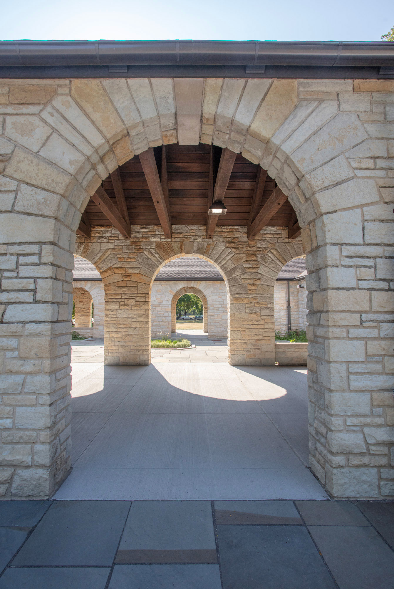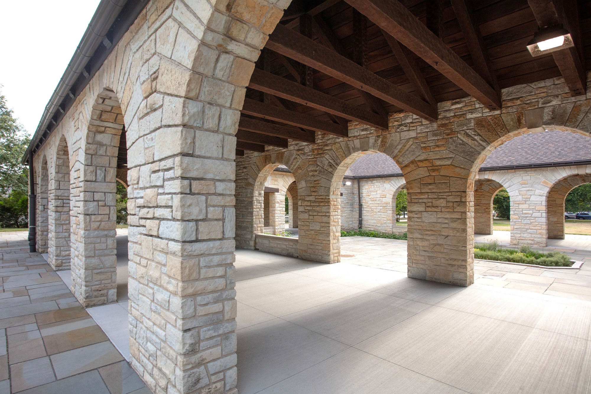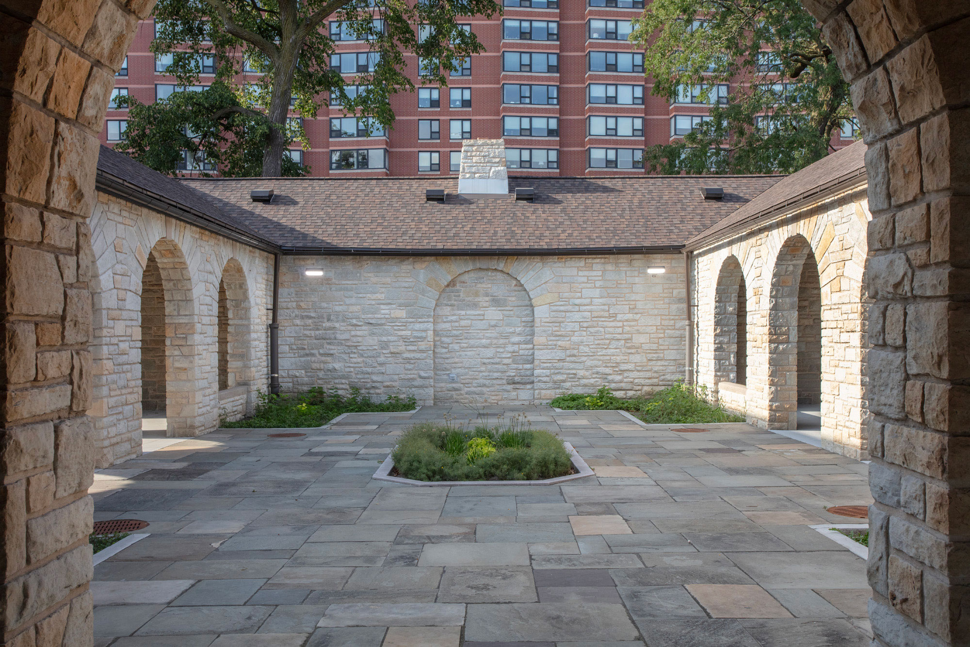 The project included accessibility upgrades, restoration of original wood doors and hardware, new replica aluminum windows, masonry repairs to the limestone cladding, roof replacement, plumbing and lighting upgrades, and complete interior renovation of restrooms. The site work also created a new and improved accessible path leading to the building restrooms, arcade, and courtyard.