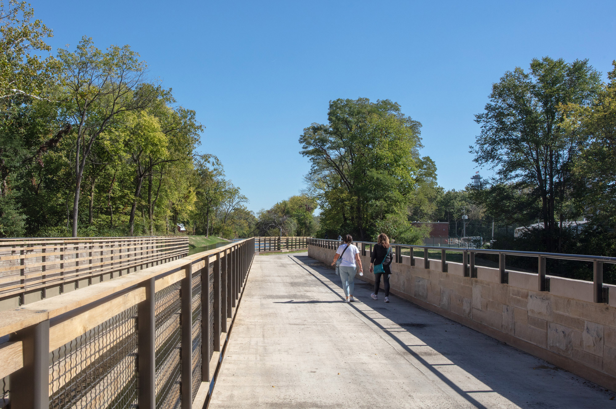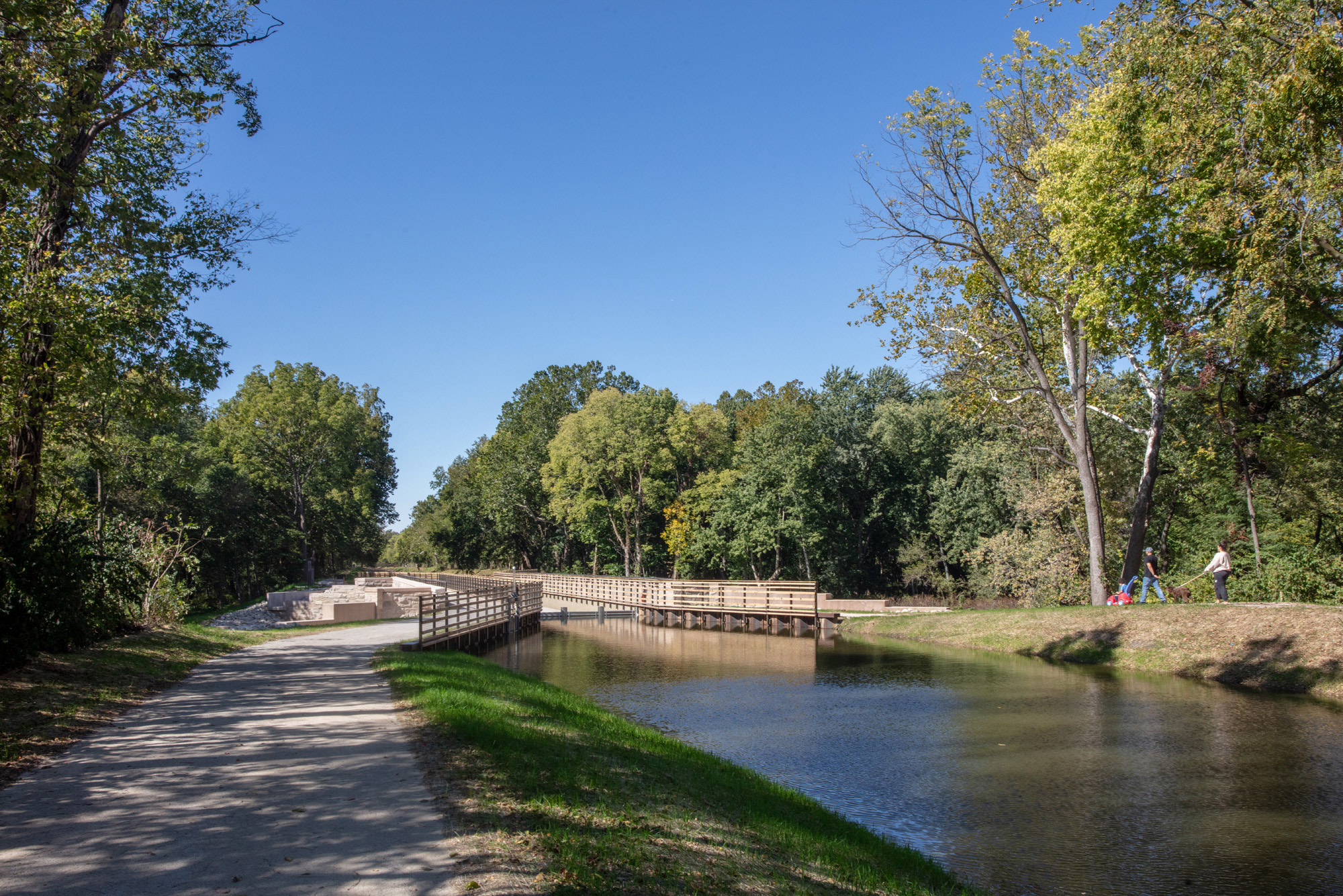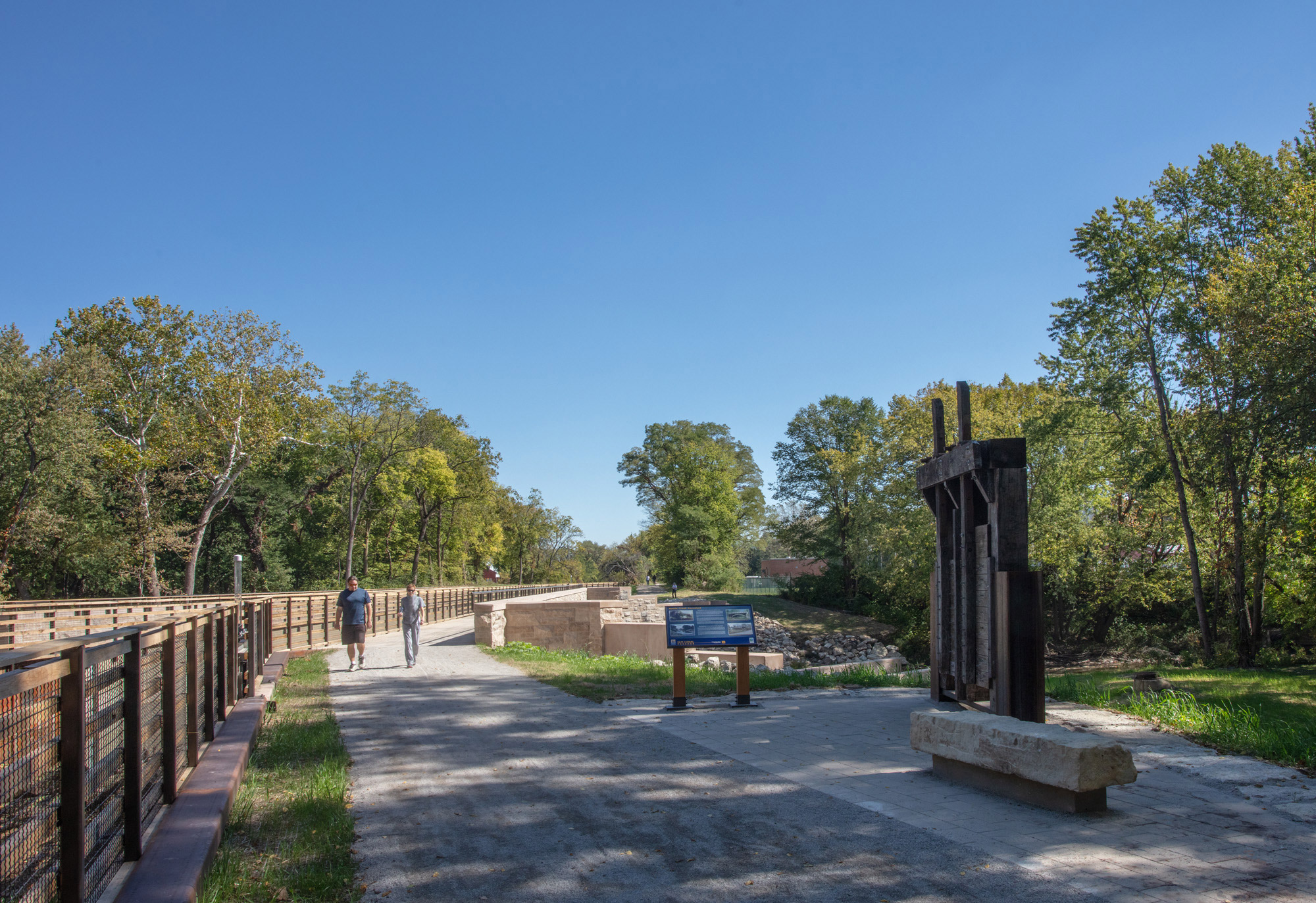 JLK also designed interpretive signage and coordinated display of the wood and iron sluice (or waste) gate, which historically regulated water inside the canal, and limestone blocks along the newly incorporated walking/running pathways.