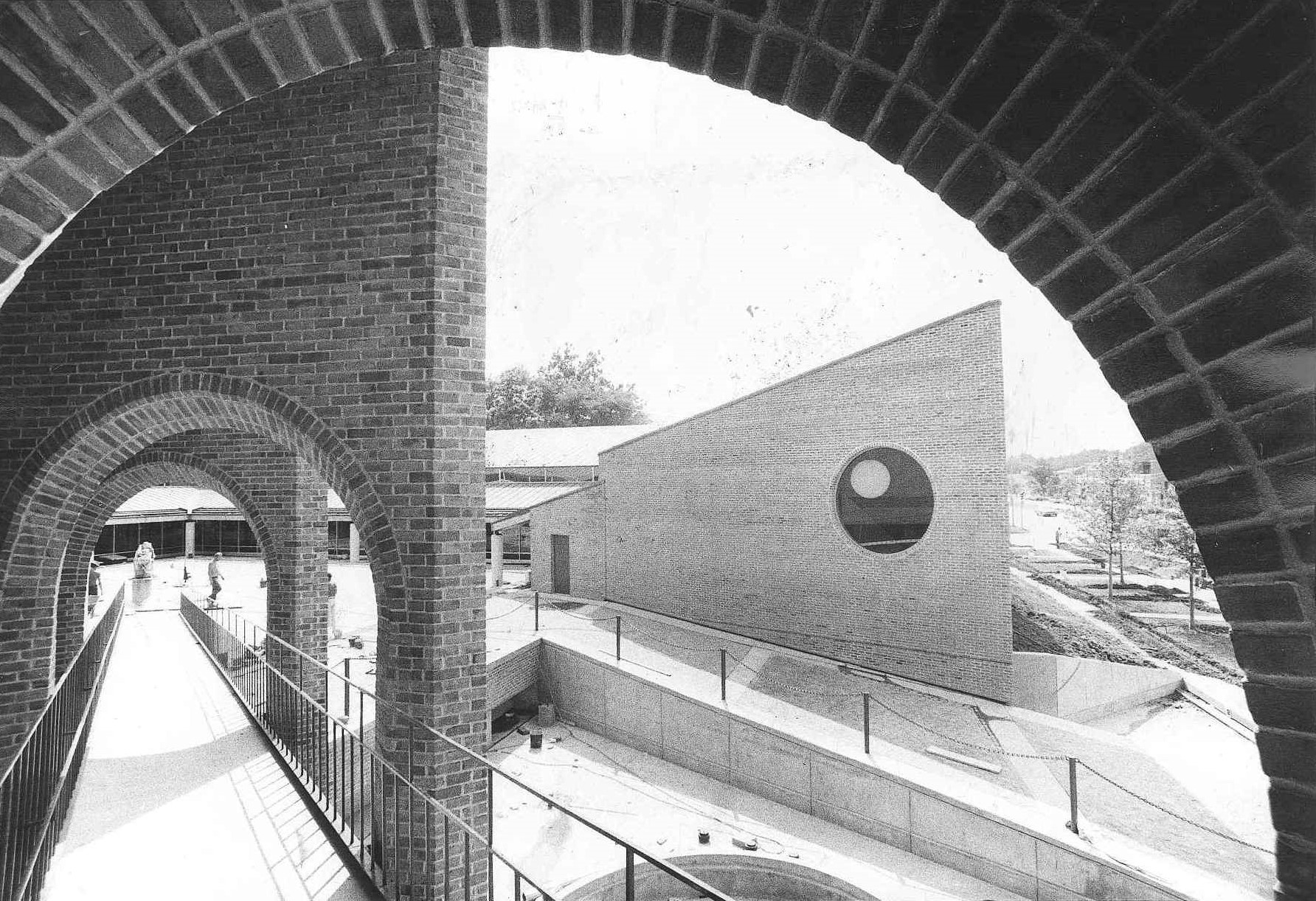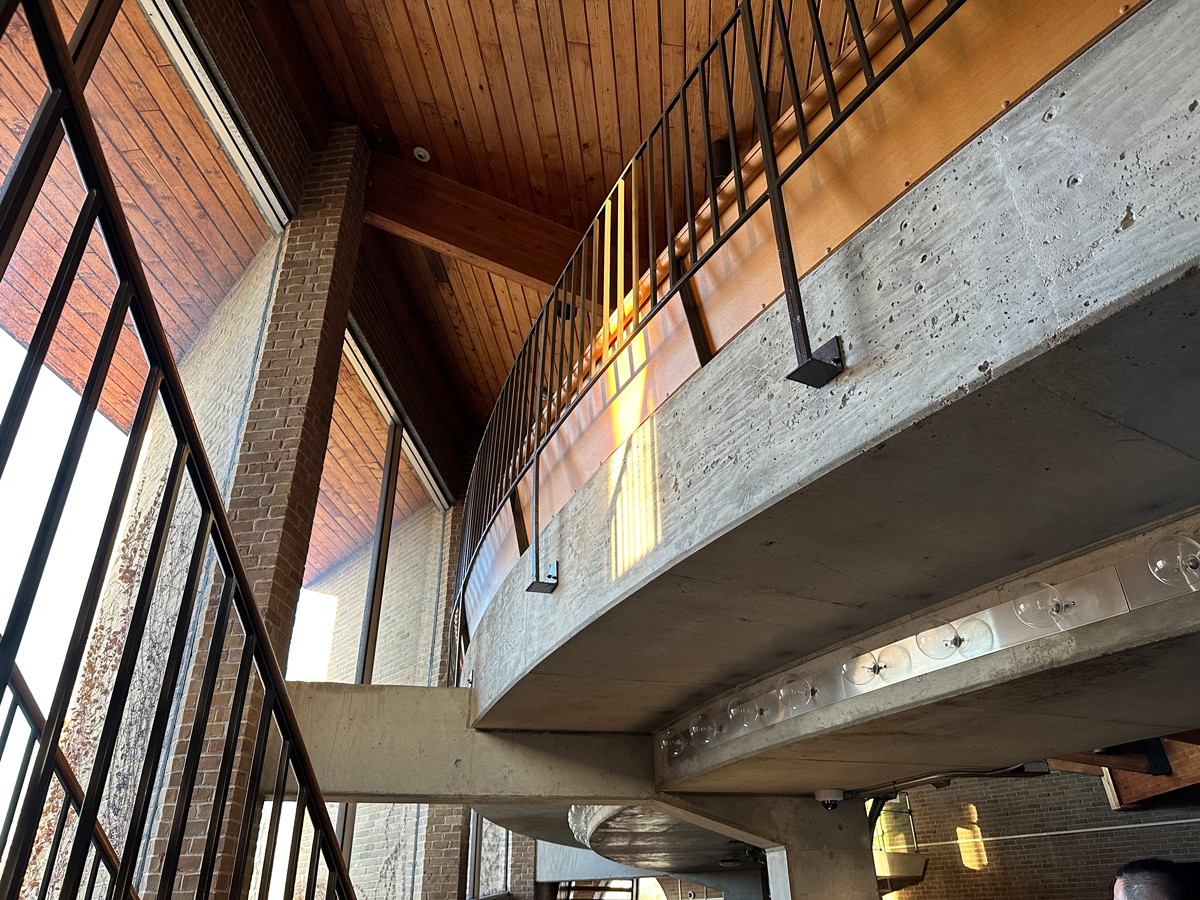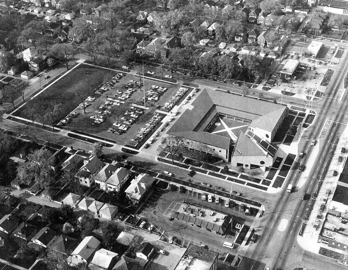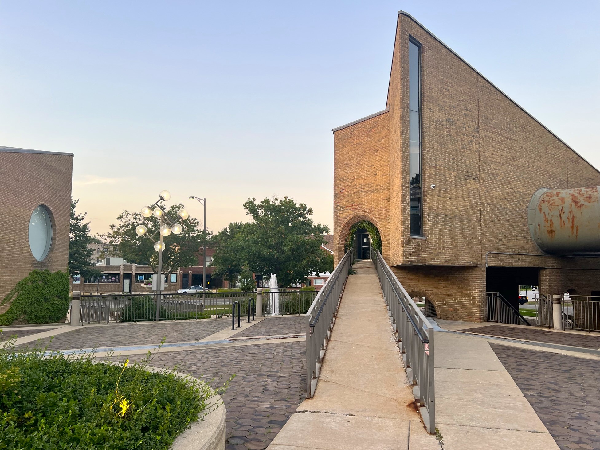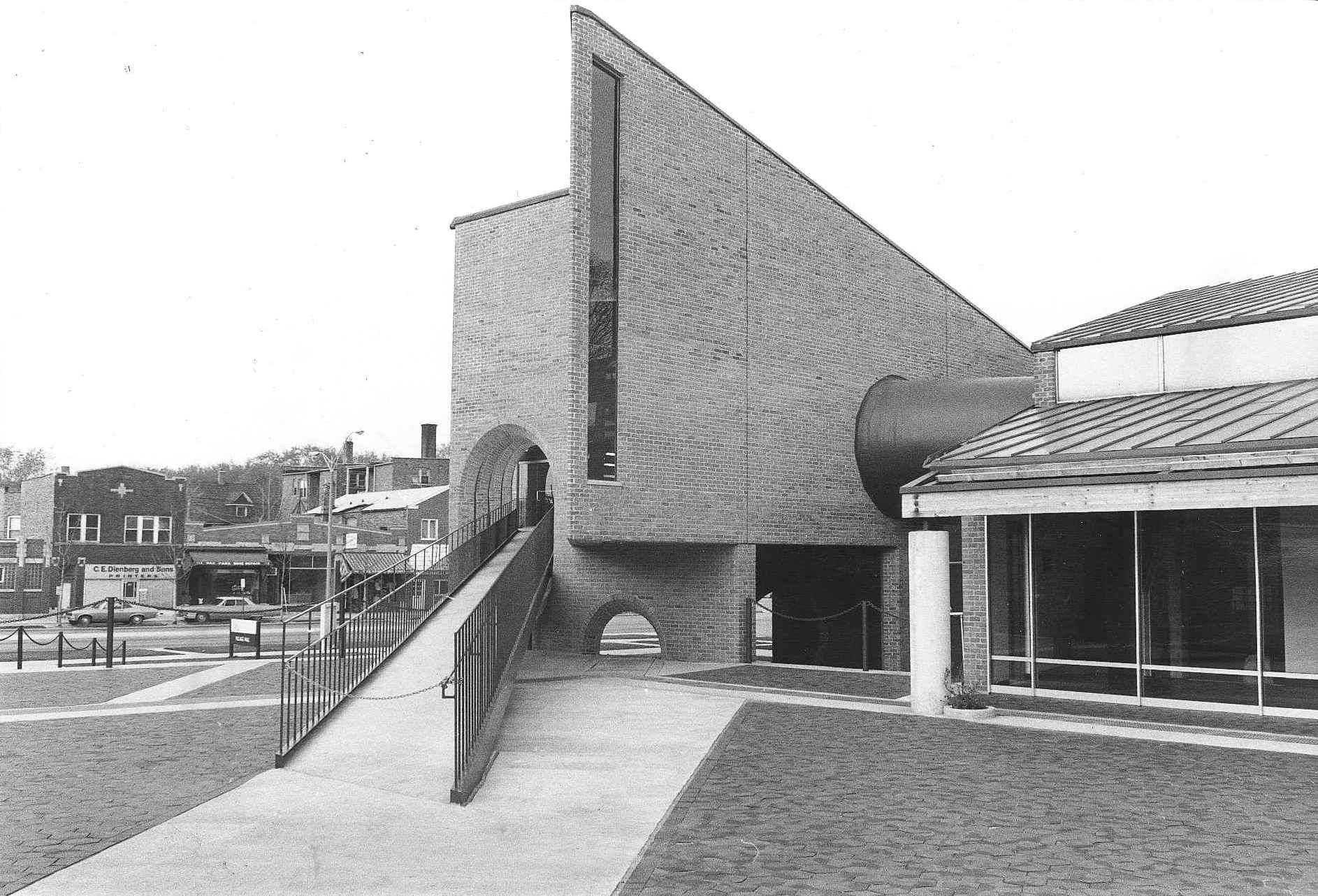 Designed by Chicago Architect Harry Weese and completed in 1975, the Oak Park Village Hall was added to the National Register of Historic Places in 2014. The building is significant for its design and location which is assocaited with the village’s efforts to achieve racial integration and community stabiliation. The philosophy of “open and transparent government” is woven into the architectural design of Village Hall, including its overall form, materiality, and spatial configuration. At the heart of the building and site is an open, public plaza surrounded by a glass storefront that places government operations on full display. The jewel of the building is the floating Council Chambers which is accessed via a long exterior ramp and an interior walkway tube.