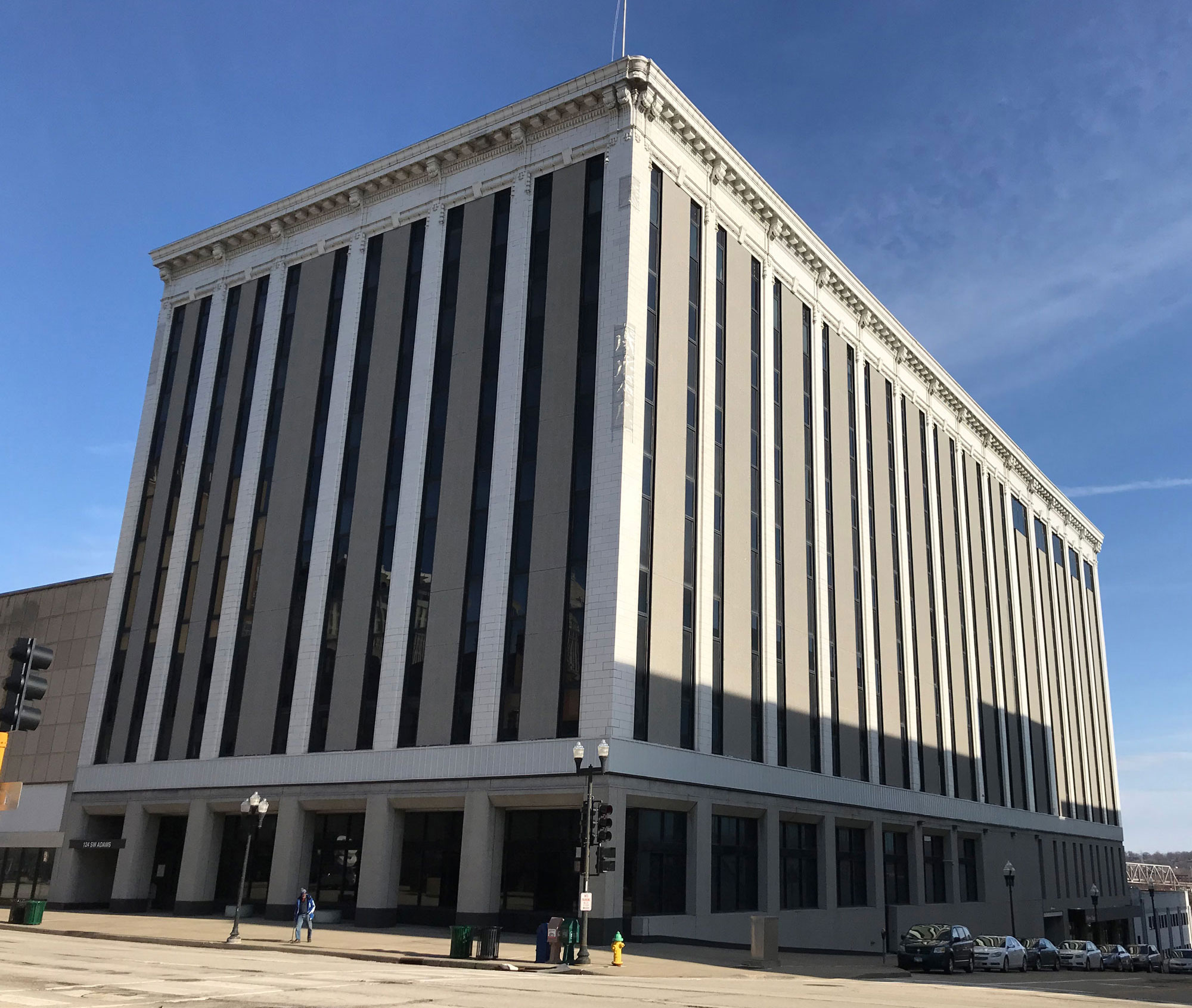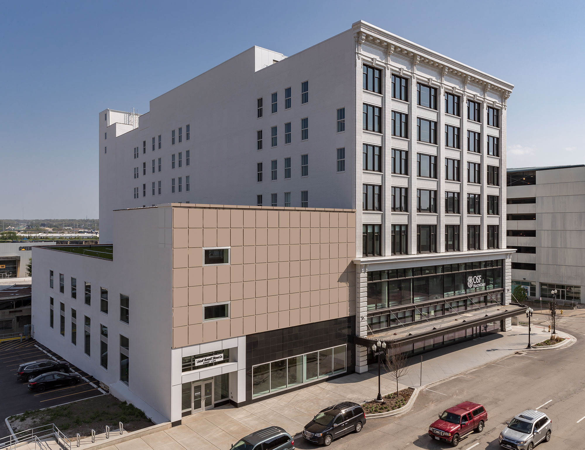 Opened in 1905, the Schipper and Block department store building was Peoria’s first steel-framed structure. The seven-story building is clad with white-glazed terra cotta that led to local’s calling it “The Big White Store.” Ownership of the building changed several times throughout the twentieth century, but the building remained a thriving department store until the mid-1970s. Several banks occupied the building through 2015 when it was sold to Caterpillar. Initial plans for demolition fell through and the building remained vacant and deteriorating until OSF HealthCare aquired it in 2018 with the intent to invest in downtown Peoria and return the building back to its former glory. Today, the 275,865-square-foot rehabilitated space can accomodate nearly 750 employees.