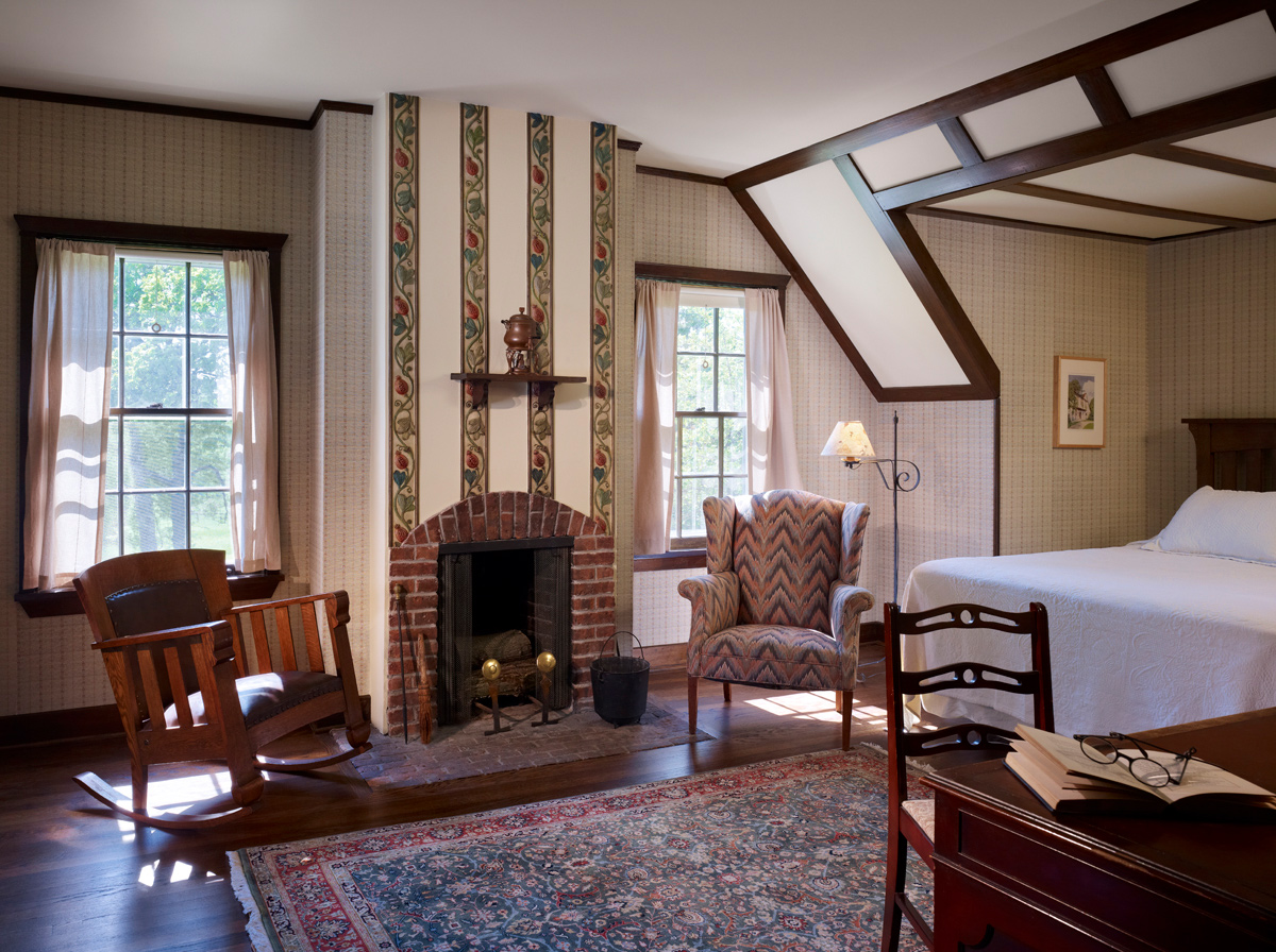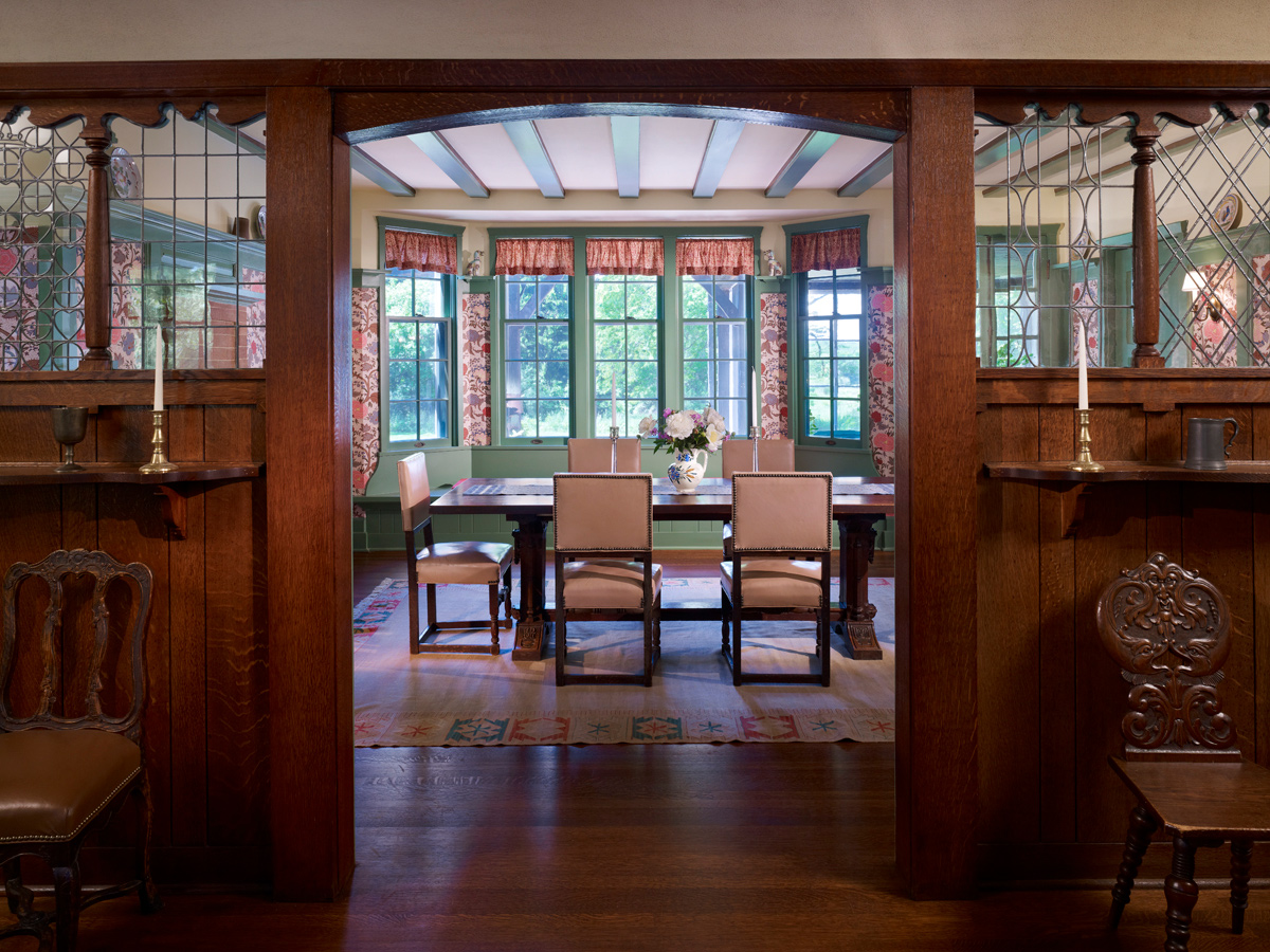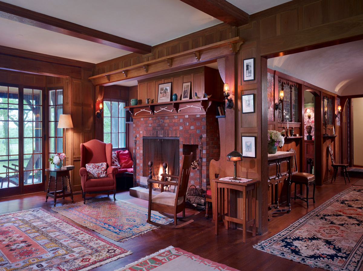 All of the interior spaces and finishes were restored. The plaster was repaired and replaced in-kind where needed, the original oak wood work was refurbished, and the fireplace was restored. JLK worked closely with the Ragdale Foundation to restore interior finishes, including the recreation of Arts and Crafts wallpapers that cover many of the interior walls.