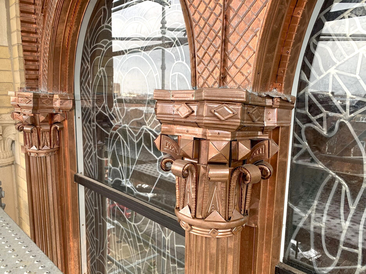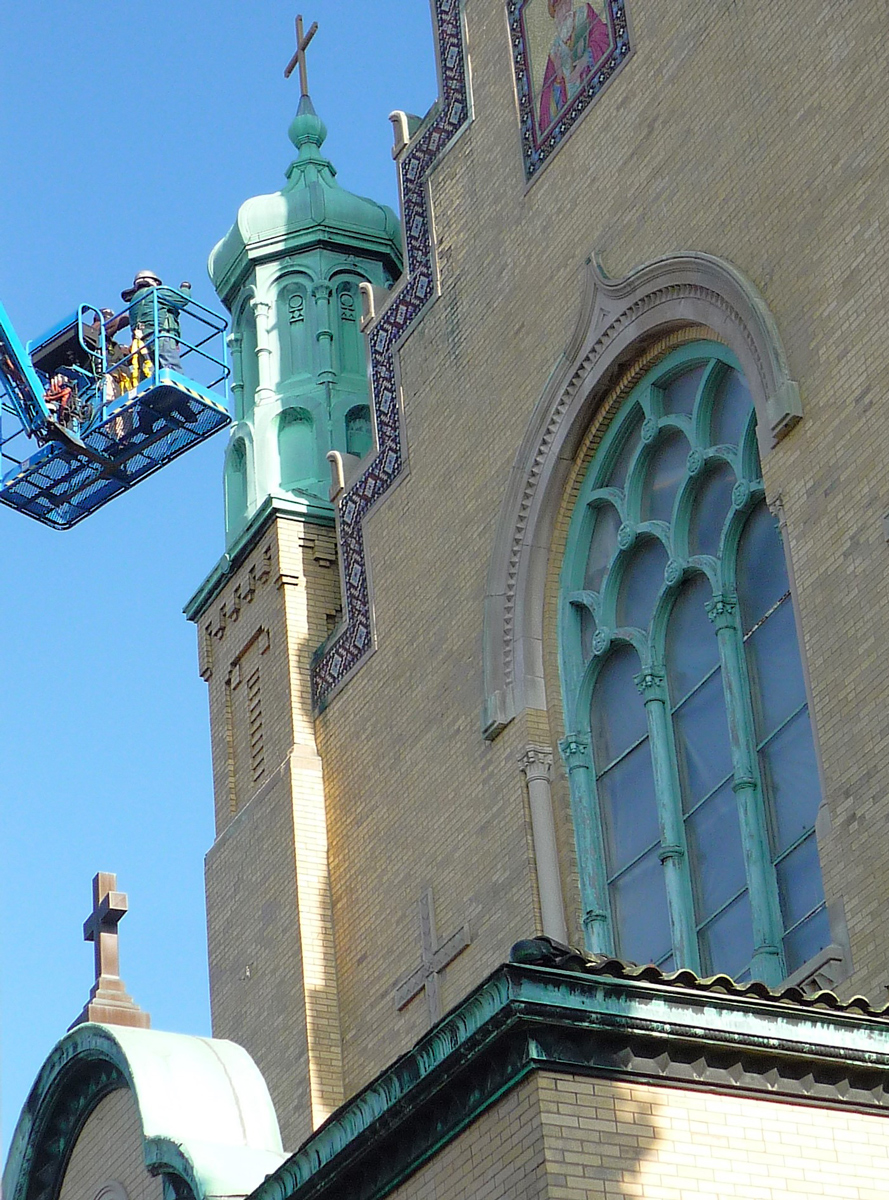 JLK began by conducting thorough research and conditions assessments to identify and assess the significant materials, features, and spaces of the building. The most significant deteriorated conditions were found at the domes, roof, and art glass windows. Early project phases included roof replacement, new details at all penetrations and gutters, and masonry pointing and restoration. The roof is clad green glazed clay tiles that were carefully restored and replaced in-kind where significant deterioration existed. The 13 copper domes and stained glass windows are being restored in sequential phases. More durable, compatible materials, such as copper, are being utilized to restore some windows. Final phases will include plaster repairs to the highly decorative interiros, lighting restoratio and upgrades, and audio-visual upgrades.